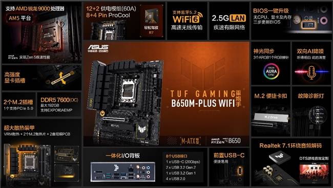 TUF GAMING X870-PLUS WIFI主板采用16(80A)+2(80A)+1供电模组,搭配双8Pin ProCool高强度供电接口,可充分发挥AMD锐龙9000系处理器性能。全方位散热设计,包括超大散热装甲,让供电区更加冷静,以获得更好的性能。支持AMD EXPO和AEMP(华硕增强型内存配置文件),可解锁DDR5满血性能。主板还支持混合双模超频、AI智能超频、AI智能散热2.0以及AI智能网络2.0,多维度优化PC,令电脑更聪明。板载PCIe 5.0 x16插槽,前瞻性支持旗舰显卡。还有4个M.2接口,其中2个支持PCIe 5.0,充分满足用户的扩展需求。显卡易拆键和M.2便捷卡扣2.0,让装机更简单。双USB4接口传输速度可达40Gbps,前置USB Type-C接口传输速度高达20Gbps,并支持30W PD快充。板载WiFi 7+2.5G有线网卡,为用户带来更快、更稳定的网络环境。易拆式天线即插即用,在优化WiFi天线安装体验的同时,提高无线性能。支持AURA SYNC神光同步,板载3个第二代可编程ARGB灯效接针,可与兼容设备实现光效联动,轻松打造专属电竞氛围。