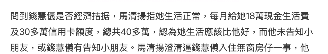 马清扬是香港大生银行的后人,他的父亲马锦灿创办了大生银行,所以他是富家子弟,在身份上,如今他还是大生地产的董事与副主席,家庭背景雄厚,财力雄厚,而钱慧仪当年嫁给马清扬,的确是嫁入了豪门。不过马清扬不是家族继承人,所以他会宣称是家族有钱,不是自己有钱,当然对于有钱的定义,每个人的标准都不同,他自称每个月会给钱慧仪18万的现金生活费,以及高达30万的信用卡额度,合计48万元,这算是有钱吗?但如果有钱,又怎么会为700万的律师费犯难,这的确令人匪夷所思。