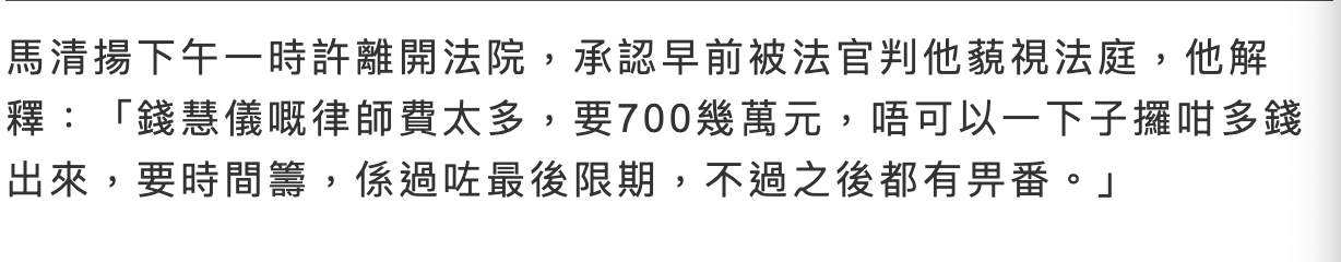 马清扬在出庭后离场时被媒体逮住,对于被曝藐视法庭这件事,他也大方承认有此事,并且解释称,钱慧仪要的律师费太高了,高达700万,一下子根本就拿不出那么多钱,需要时间筹款,结果过了法院的限期,不过最后还是补上了。
