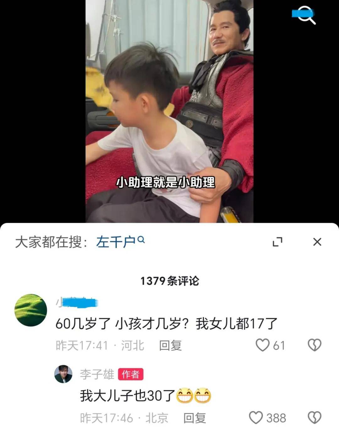 李子雄每次跟儿子同框,父子俩的年龄差总能引来网友热议。李子雄这次没有回避,回复一位网友说自己还有一个已30岁的大儿子,可能觉得这点会让自己看起来“正常”一点?