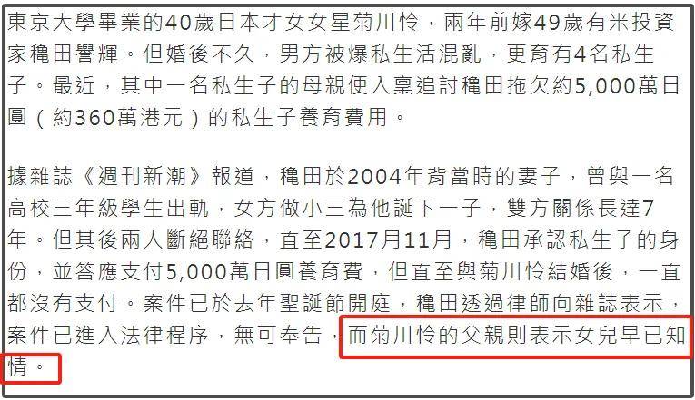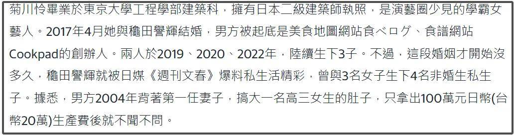 2017年,菊川怜嫁入豪门,同年丈夫就曝出私生子丑闻;2019年,菊川怜怀孕生下一胎,同年丈夫又被曝拖欠私生子抚养费;2020年,菊川怜再次怀孕生下二胎,丈夫依旧丑闻不断;2022年,菊川怜怀上三胎,每一次丈夫爆出丑闻,她的反应都是“我知情我原谅”,连菊川怜的父亲都出面维护女婿。