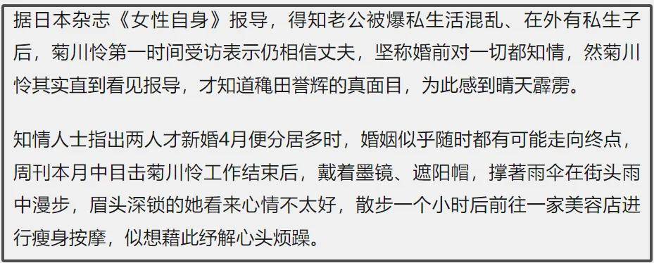 反正有知情人爆料,菊川怜根本不知情,直到丈夫丑闻曝光,她才发现所嫁非人,已经考虑分居想要离婚了。