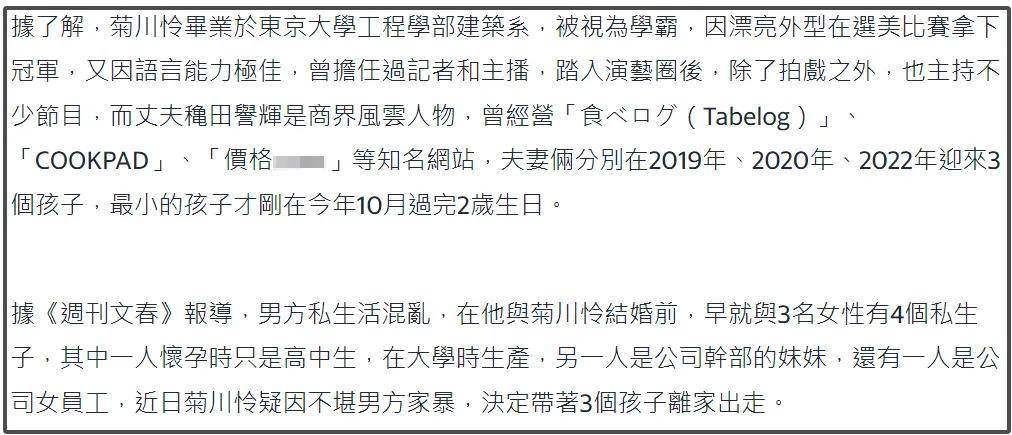 2024年11月,有爆料称菊川怜遭到丈夫家暴,她带着三个孩子离家出走了。