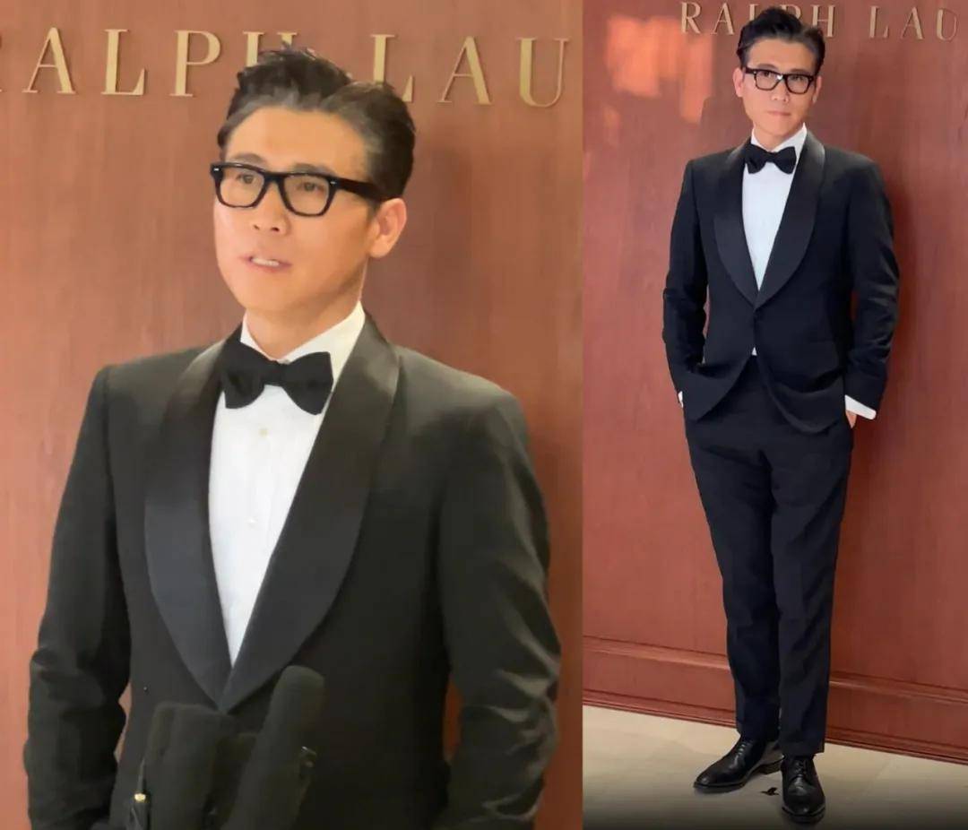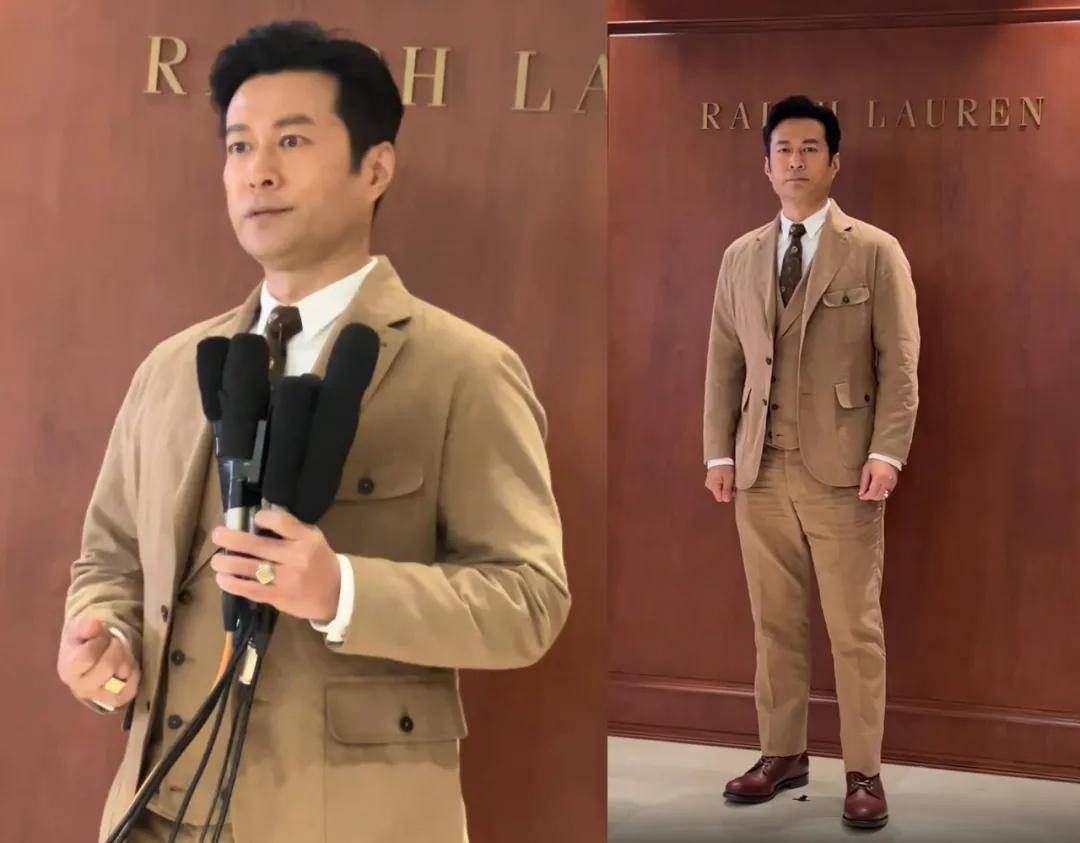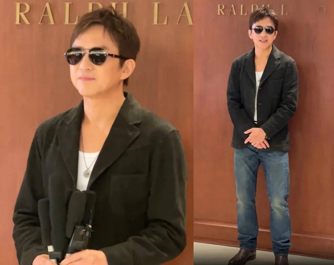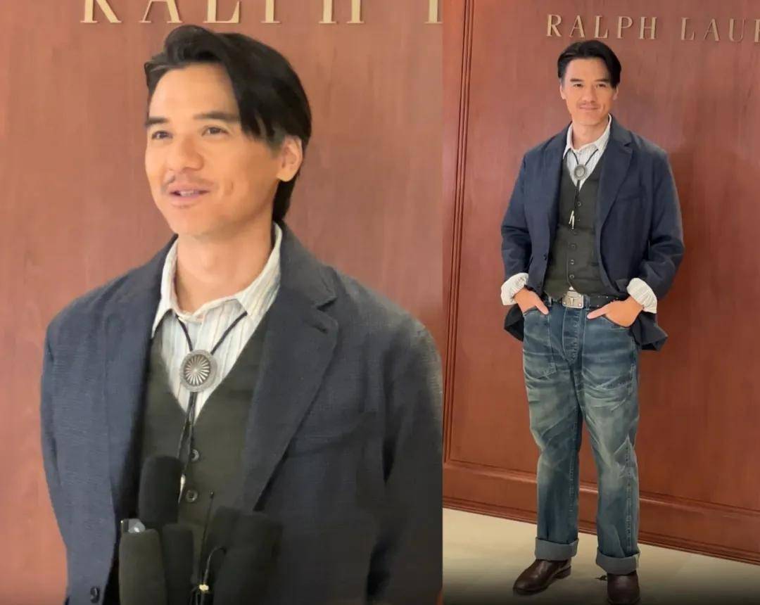 冯德伦上半身的衬衫、马甲和西装外套的穿搭挺隆重的,结果下半身搭配的是休闲的牛仔裤,凸显了五五分的身材比例。50岁的他脸上已经有明显的岁月痕迹,从前的痞帅男明星变成了痞帅大叔。