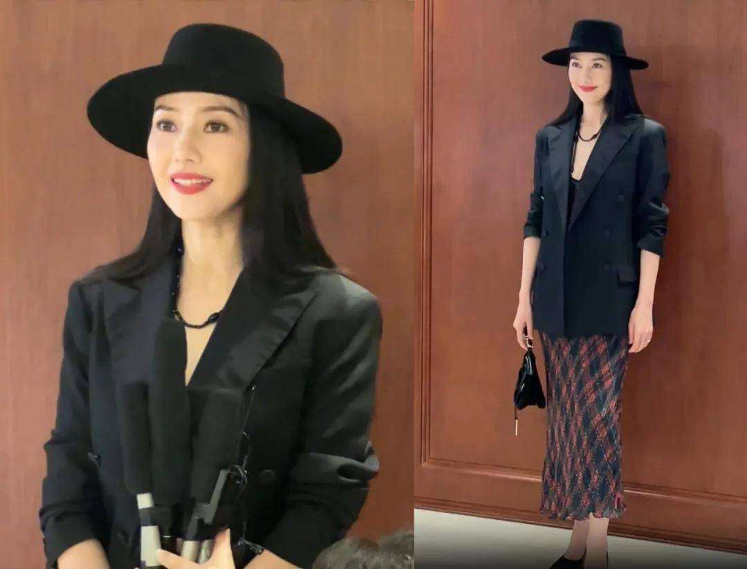 高圆圆穿的是黑色休闲西装外套搭配格纹半身裙,一般人穿这样再戴个礼帽可能会有些奇怪,但放在她这样的大美人身上似乎就合理了。