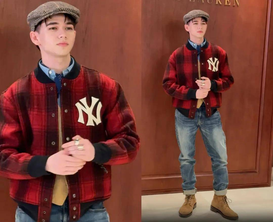 曾在中国参加选秀但没能成功出道的美日混血爱豆庆怜,穿了红色格纹夹克和牛仔裤,很有街头男孩的感觉。