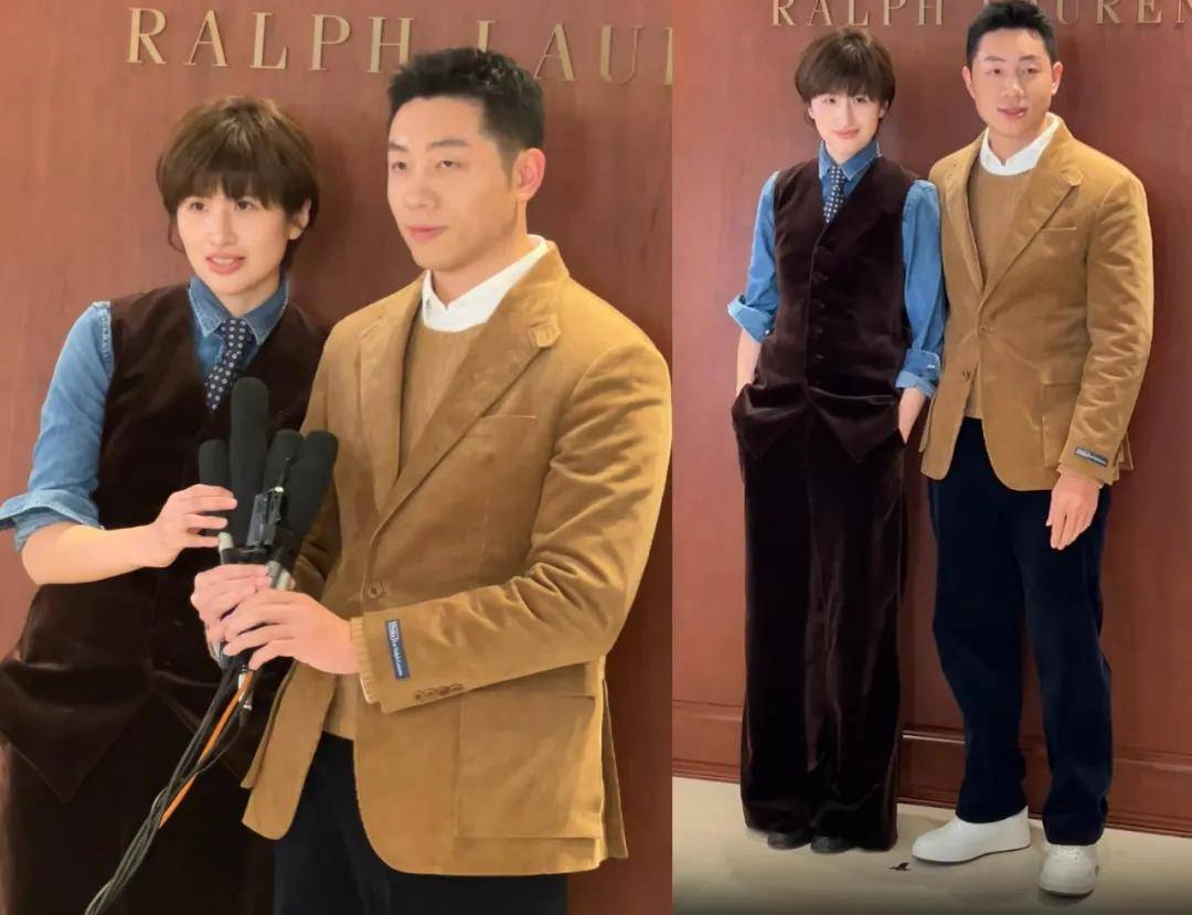 许昕和夫人姚彦都穿了丝绒套装,只不过姚彦的气场看起来更强,面对大场合游刃有余的感觉。
