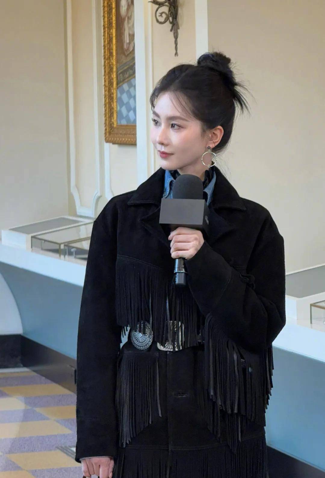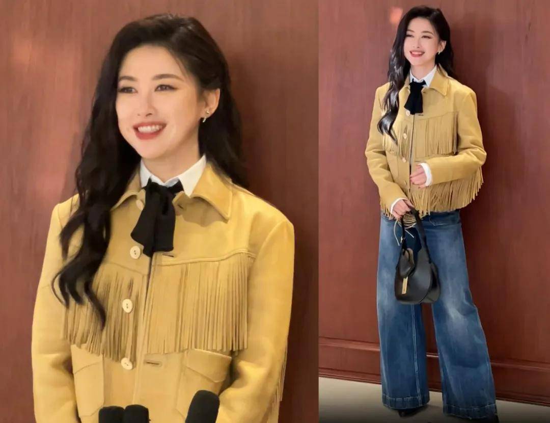 朱珠穿的是黄色流苏皮衣和牛仔裤,红唇卷发是她的标志性“武器”,她的生图总给人漂亮且松弛的感觉,一颦一笑都特别有魅力,不是那种只能活在美颜滤镜和高颅顶网红妆里的假面美人。