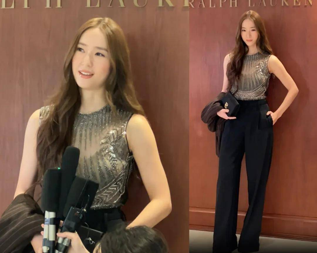 韩国爱豆郑秀晶穿的是透视刺绣上衣和黑色西装裤,一如既往的御姐。出道这些年来她的外形几乎没有变化,无论哪个时期都美。