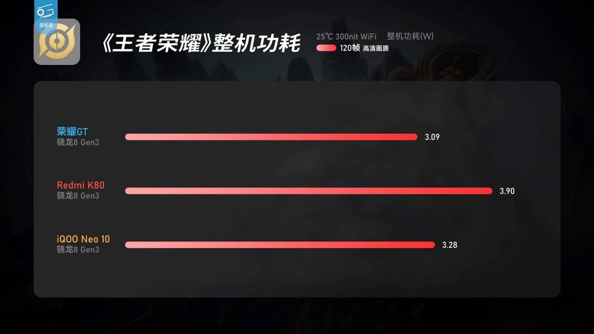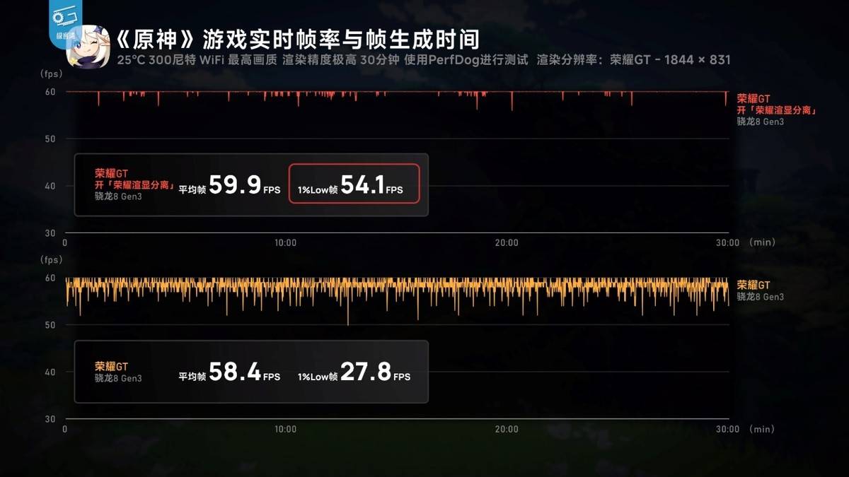 另外测试信息显示,开启荣耀AI渲显分离模式,手机在《原神》游戏过程中实时帧率与帧生成时间,都有着明显的区别;同时与友商档位手机相比,荣耀GT在玩《王者荣耀》时整机功耗方面最低,表现最为优秀。