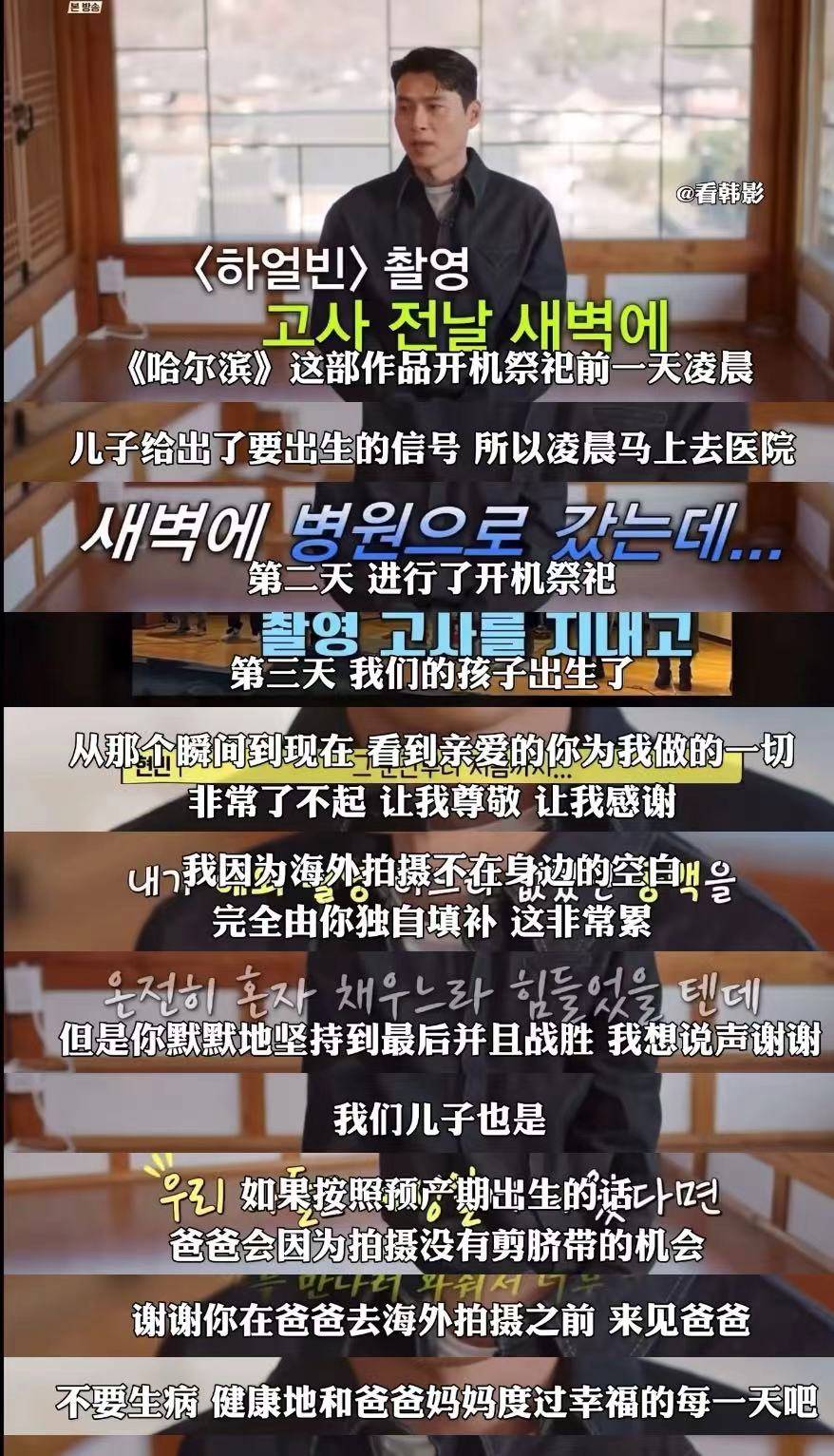 玄彬演出电影《哈尔滨》的时候儿子有出生的信号,他凌晨赶紧去医院,第二天进行了开机仪式,第三天儿子出生。玄彬对老婆孙艺珍表示感谢和尊敬,认为看到亲爱的为他所做的一切,非常了不起。因为产后玄彬就去国外拍摄电影,不在老婆身边陪伴她,而且非常累,但孙艺珍默默坚持到最后并且很好地带着孩子坐月子,玄彬对老婆说声谢谢。