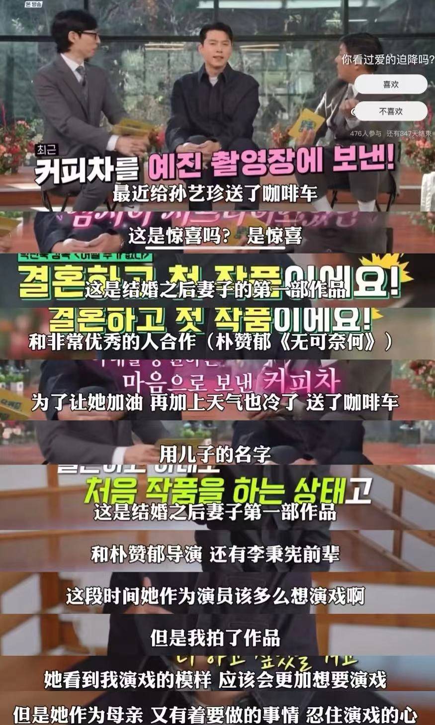 玄彬为老婆送去了应援的咖啡车,因为这是孙艺珍婚后的第一部戏,而且和很优秀的电影人朴赞郁李秉宪合作,用儿子的名字送的应援。还表示孙艺珍也是演员,她应该很想演戏,玄彬演出了《哈尔滨》,看到自己演戏,老婆应该会更加想要演戏。但是作为母亲,又有着想要做的事情,忍住演戏的心。