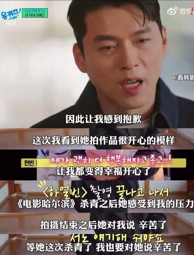 玄彬说自己去演戏,老婆却在做母亲,让他很抱歉,看到她能够演出电影很开心的模样,也让他变得幸福开心,电影《哈尔滨》杀青后,孙艺珍也感受到老公的压力,拍摄结束之后对他说辛苦了,这次老婆新戏杀青了,他也对老婆说辛苦了。