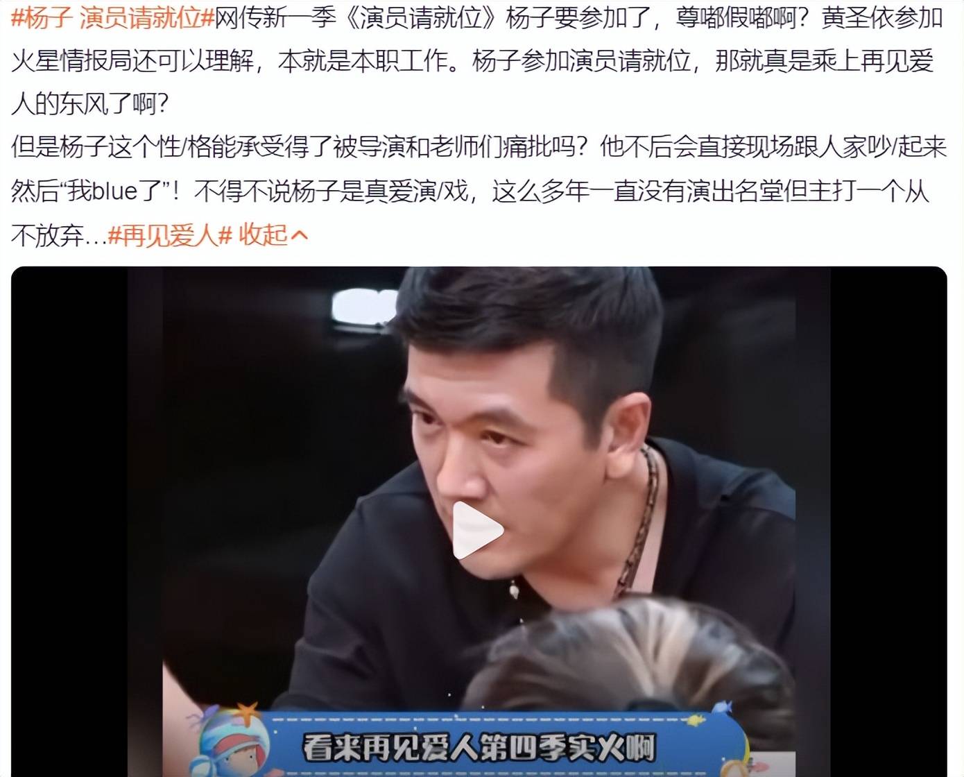 另一方面,杨子居然要去演戏综艺,就算他曾经自己开公司当演员拍戏,但毕竟不是专业演员,作品热度口碑都不好,时隔多年,方方面面更不适合拍戏,居然还去网综参加比赛,这不就是故意去炒作博关注吗?