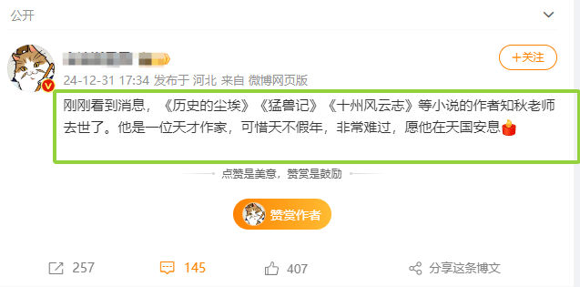翻看留言处不难发现一些细节,有网友透露:他知道知秋老师曾遇到过变故。由此来推断,知秋老师应该是因为身体方面的变故,从而传出噩耗,不过具体的一些细节,还需要其家人透露。