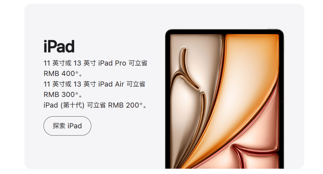 据苹果官网信息,活动期间购买11英寸或13英寸iPad Pro可立省400元;购买11英寸或13英寸iPad Air可立省300元;购买iPad(第十代)可立省200元。