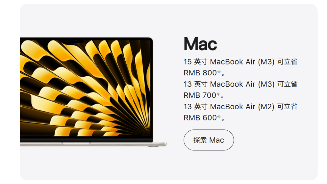 苹果官网显示,活动期间购买15英寸MacBook Air(M3)可立省800元;购买13 英寸 MacBook Air(M3)可立省700元;购买13 英寸 MacBook Air(M2)可立省600元。