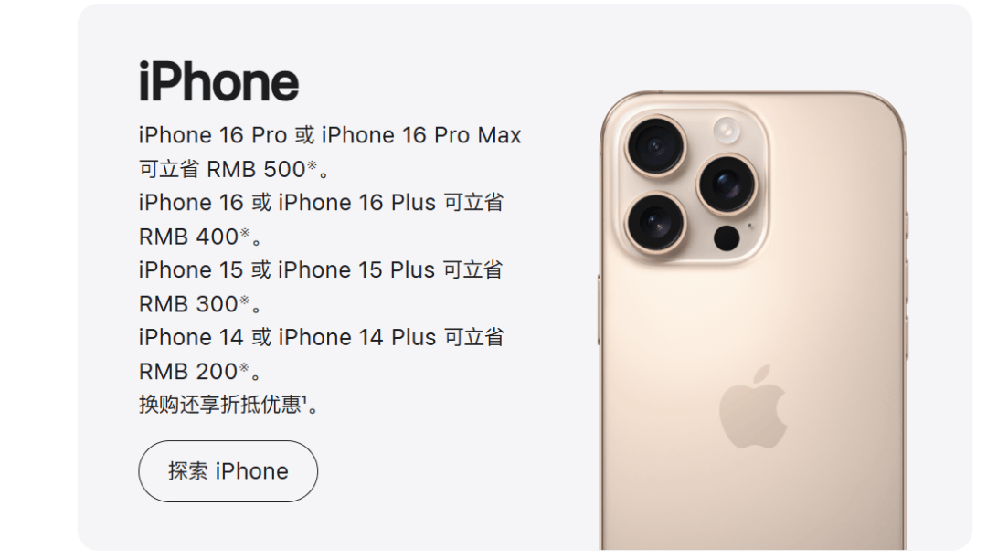根据官网消息,活动期间购买iPhone 16 Pro 或 iPhone 16 Pro Max可立省500元;购买iPhone 16或iPhone 16 Plus可立省400元;购买iPhone 15或iPhone 15 Plus可立省300元;购买iPhone 14或iPhone 14 Plus可立省200元。
