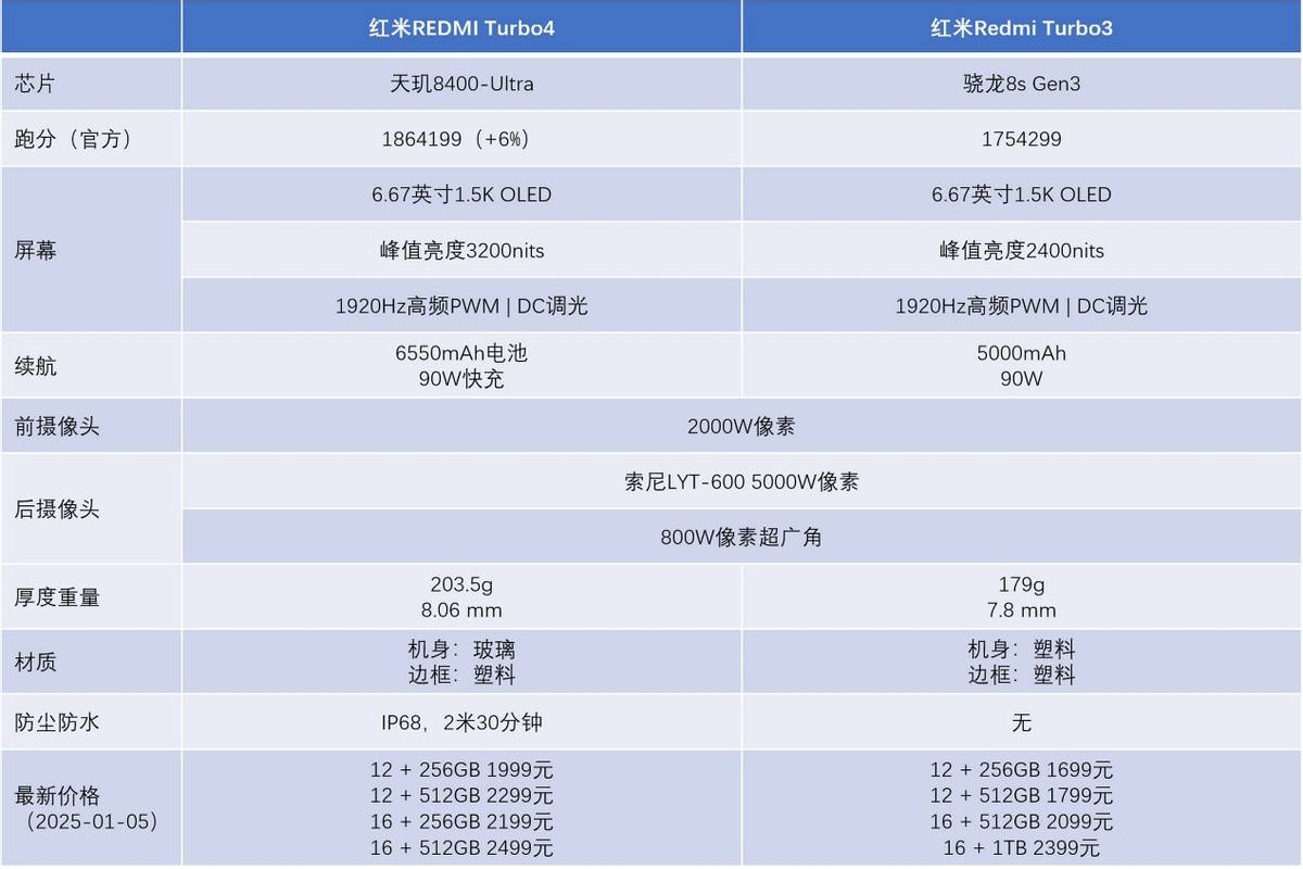 不过也有小伙伴问,现在选择红米Turbo4好还是红米Turbo3好?他有如此疑问的理由也很合理:首先是红米Turbo3便宜了,其次是好像性能差距不是那么大,第三是红米加MTK让人稍微有点不放心。当然更关键一点,他觉得前代手机的颜值更高一些。
