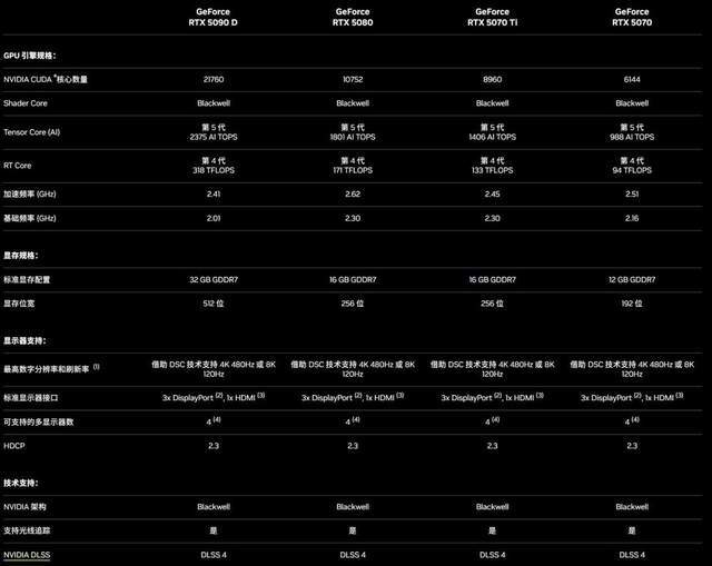 另外,国内特供版RTX 5090D这次也安排上了,而且依然有21760个CUDA核心,2.01GHz基础频率和2.41GHz加速频率,32GB GDDR7显存,这些规格和RTX 5090完全一致,只是AI性能从3352 TOPS缩减到2375 TOPS。意味着RTX 5090D的游戏性能基本没有阉割,只阉割的AI性能。