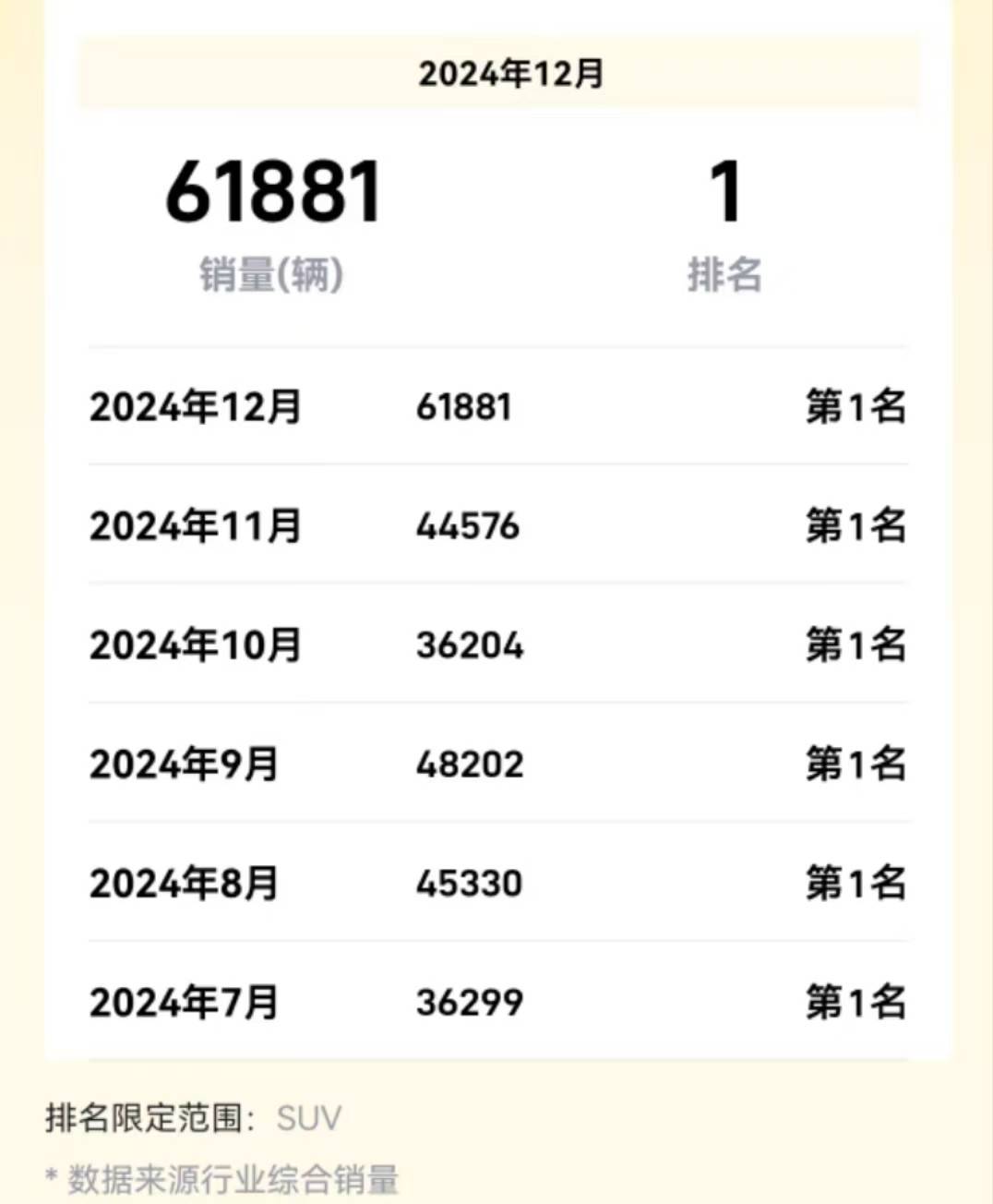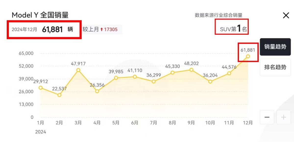 而在刚过去的2024年12月份,Model Y甚至一口气卖出去了61881辆新车,比排在第二名,身为燃油车的瑞虎8系列3.12万辆新车销量要超了差不多将近一倍。所以,12月份Model Y车型的这般销量数据,无疑是能够用“狂甩”来形容的。
