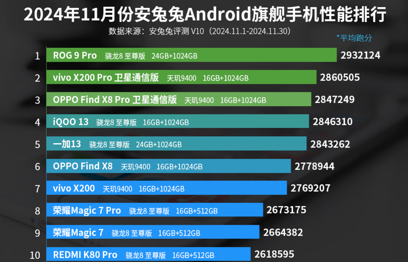 其中跑分293万+的ROG 9 Pro,曾一度排名安兔兔安卓手机性能榜的第一(2024年11月)。