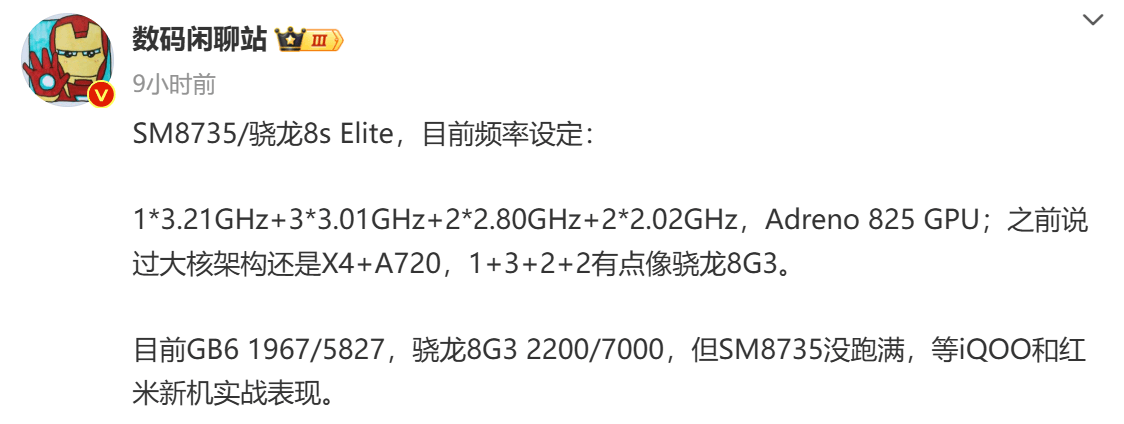 根据博主的爆料,代号SM8735的骁龙8s Elite,CPU将采用1*3.21GHz+3*3.01GHz+2*2.80GHz+2*2.02GHz的架构、大核还是X4+A720,GPU为Adreno 825。
