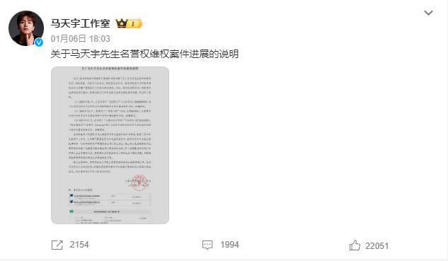 当然了,马天宇作为一个在娱乐圈混迹多年的老油条,不可能轻易被舆论裹挟,于是,他也开始出手了,1月6日下午六点,马天宇工作室发了一片声明,宣布他们开始起诉网络上造谣攻击自家爱豆的行为,并且表示除了已经起诉的,工作室还在收集证据,把每一个造谣马天宇的人都送上律师函,警告意味十分明显。