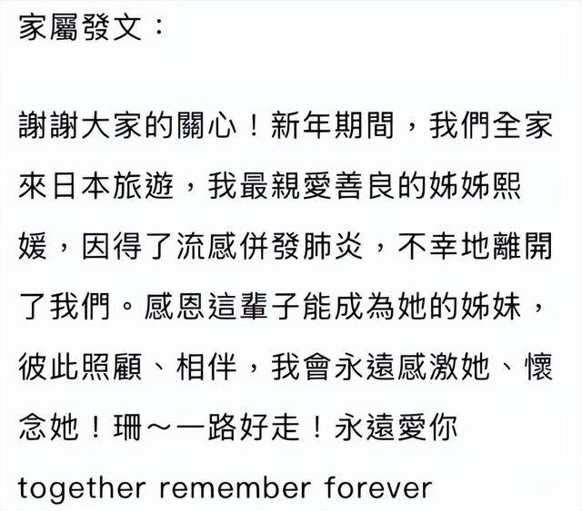 随后她的妹妹小S,也在她的社交网上感性发文,感谢大家的关心,她最亲爱的姐姐已经离开了,很感恩今生的姐妹情,她会一直怀念姐姐大S。