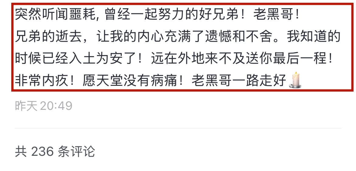 据大娃透露,他知晓老黑去世的时候,对方已经下葬,来不及送好友一程,他深感自责。也正是因为这层原因,网友的议论声非常大。