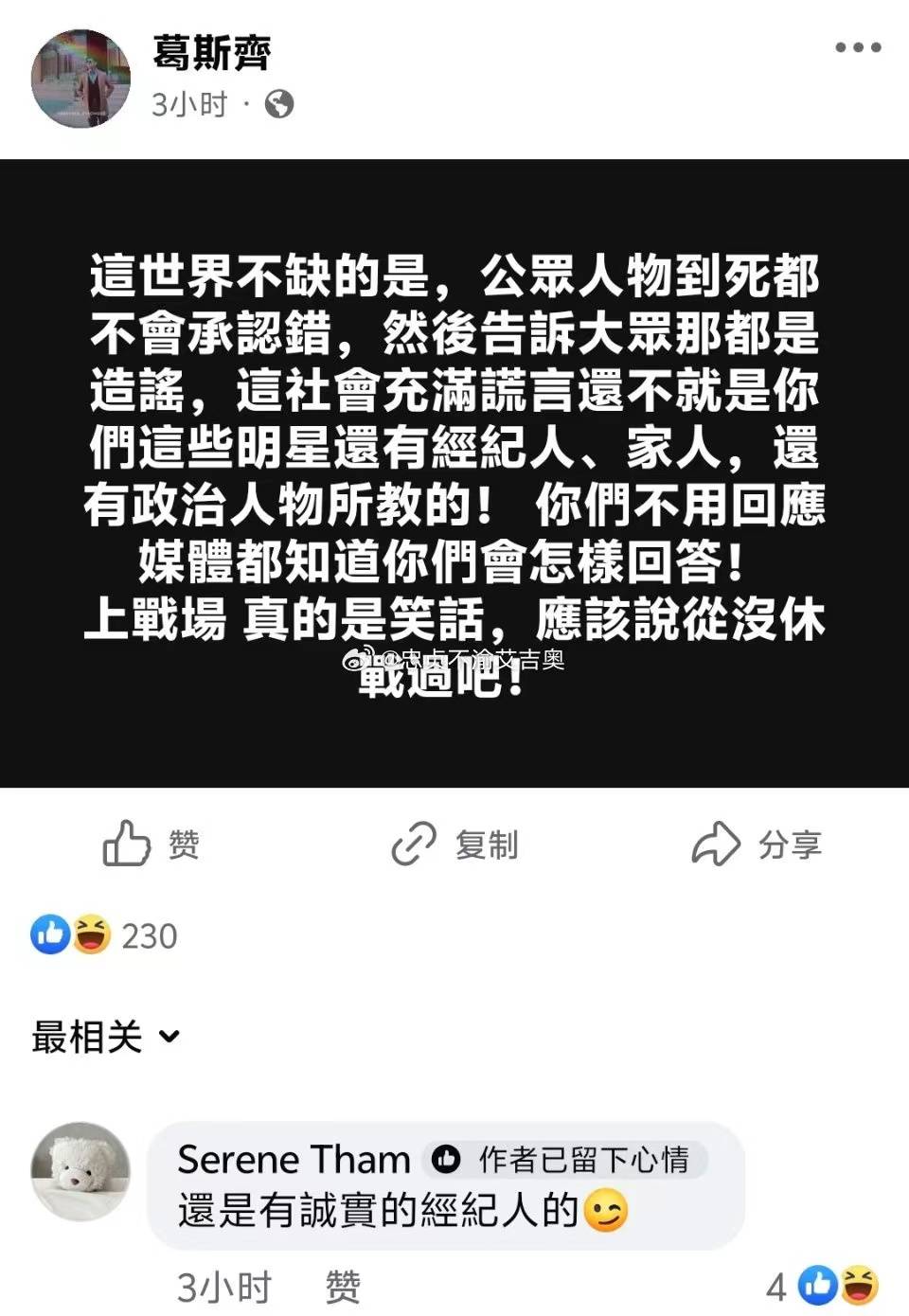 葛斯奇表示这世界不缺的是,公众人物到死都不会承认错,然后告诉大众那都是造谣,这社会充满谎言还不是你们这些明星还有经纪人、家人,还有各种其他人教的,你们不用回应媒体都知道你们会怎样回答!上战场,真的是笑话,应该说从没休战过吧?