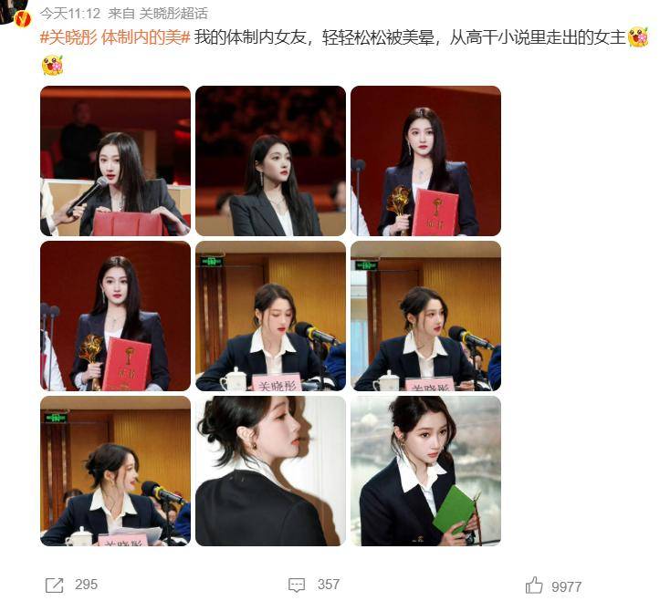 其中一个热搜发布了她的几张正装照,盛赞她有一种体制内的美,美得端庄大气。