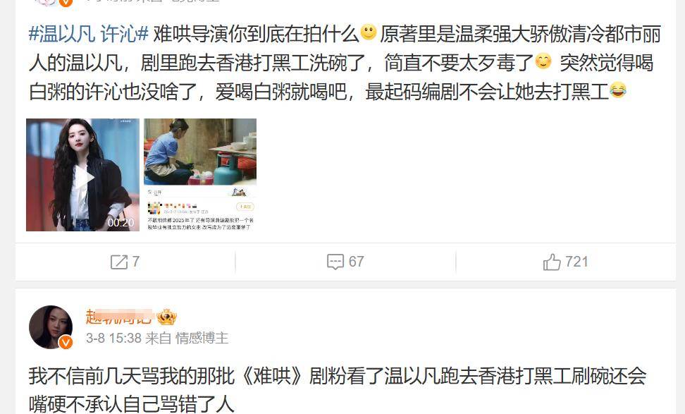 很多网友难以接受的是,温以凡的人设定位是女记者、职场丽人,却为爱放弃工作,沦落到了底层,做起了洗盘子的活。