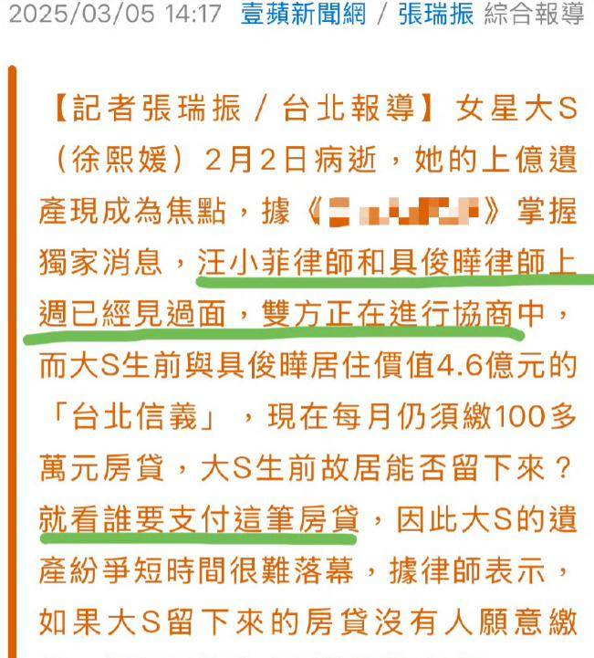 不过,除了大S下葬的问题外,很多网友还关注着一个问题,那就是大S去世还留下每月100多万的房贷,由谁来还?