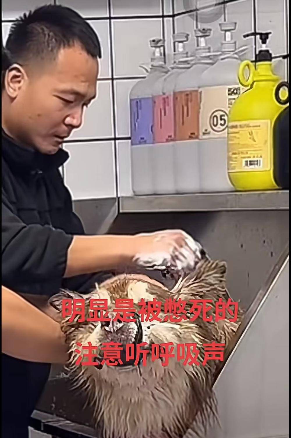 从网友录屏的直播切片中可以清晰的看到,艾特都已经翻白眼了,但是潘宏仍然没有停止清洗它,最终导致它离开了这个世界。