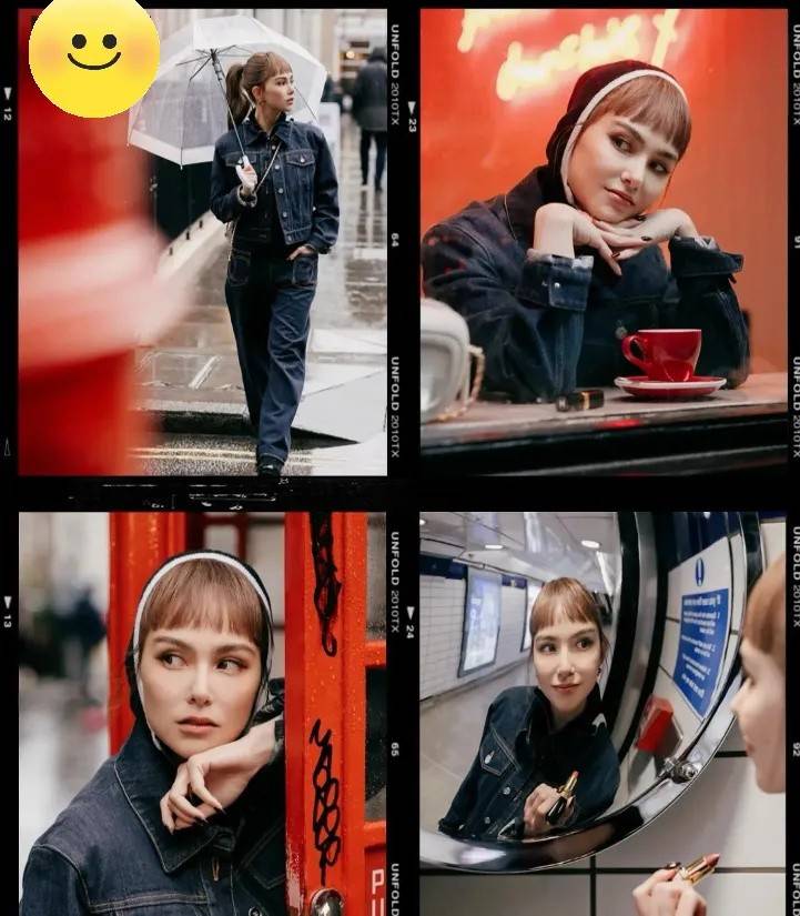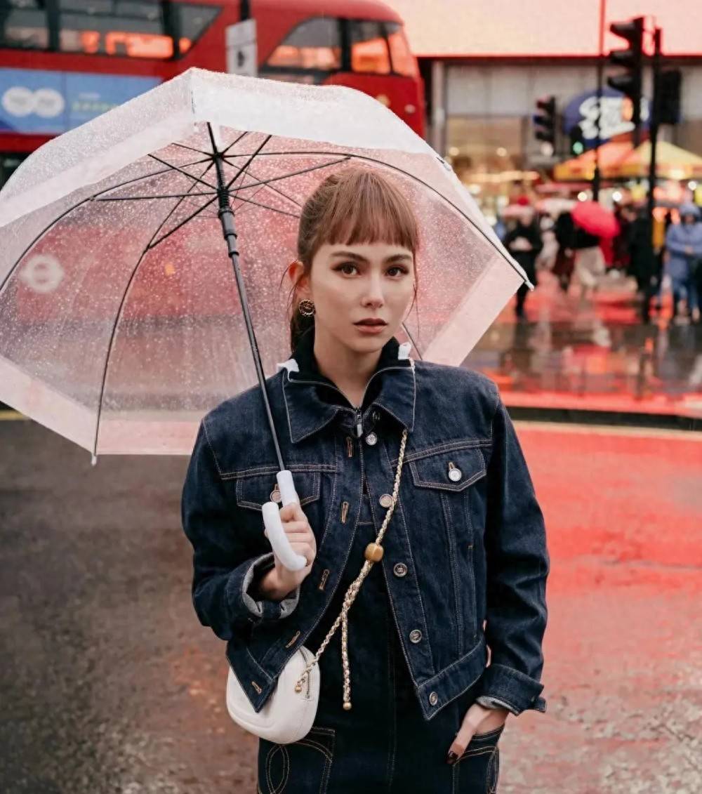 比如打着伞走在街头,歪着头坐在咖啡馆微笑。