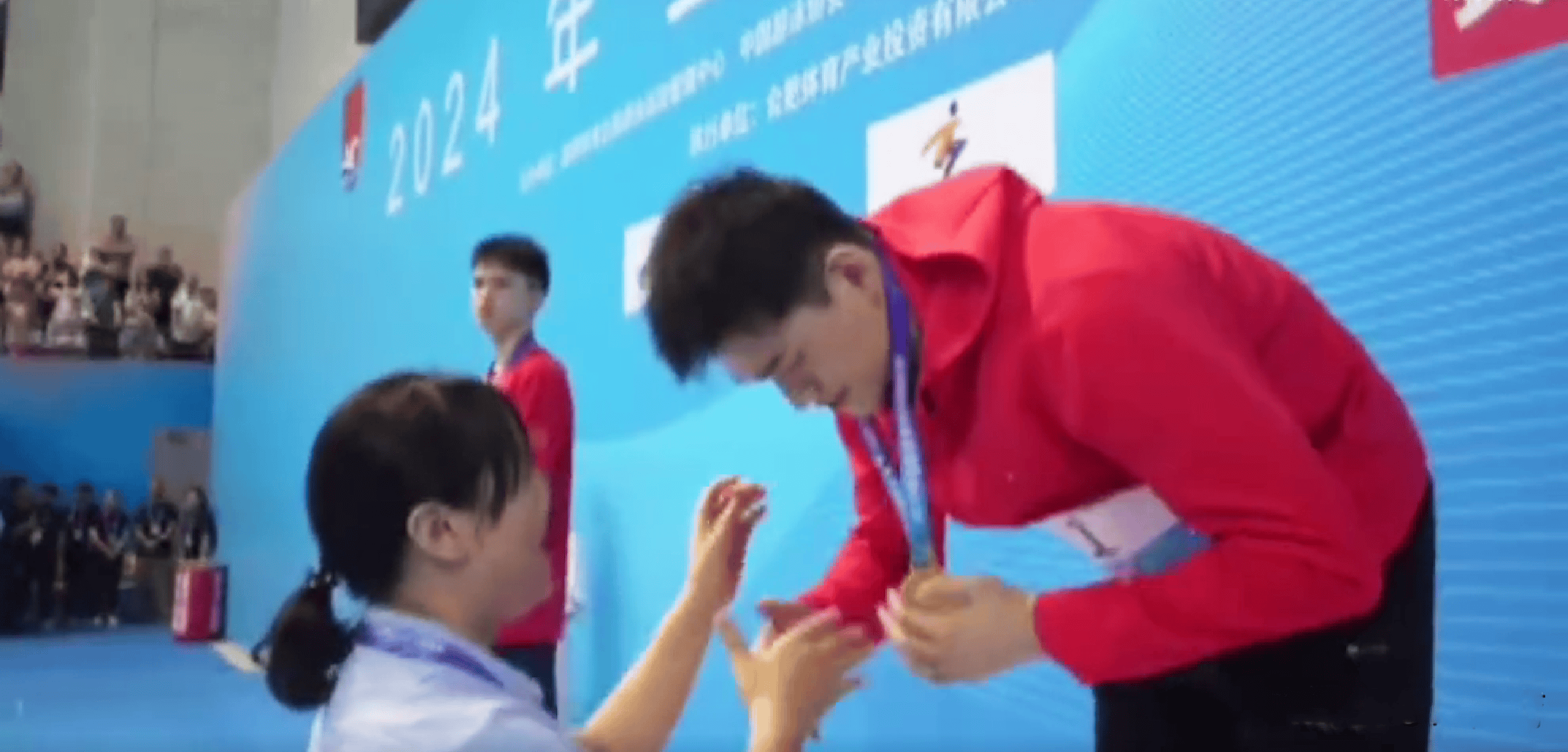 礼仪小姐还在准备金牌,孙杨已经提前弯下腰,伸长了脖子,等待戴上的那一刻。