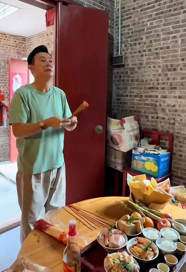 而他也亲自端出准备好的丰盛祭品,摆得整整齐齐。然后,没有半点明星架子,恭恭敬敬地按照传统仪式,上香、鞠躬、祭拜。