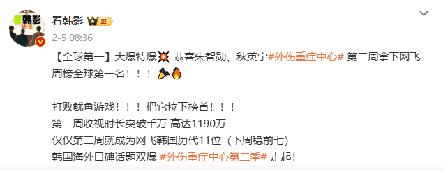 不久前的医疗爽剧《外伤重症中心》,播放量就一度击败《鱿鱼游戏》。