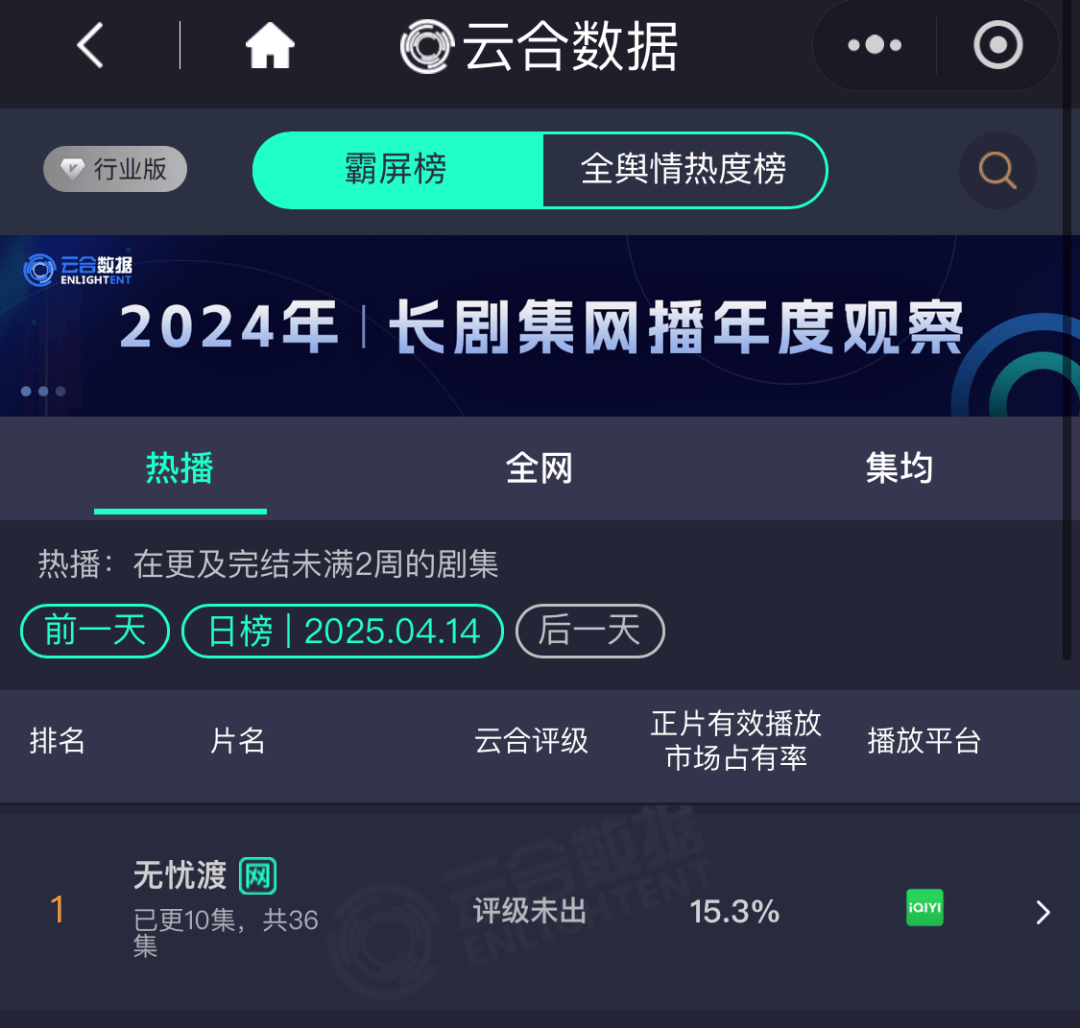自4月12日晚6点“空降”爱奇艺以来,《无忧渡》就展现出强劲的市场竞争力。