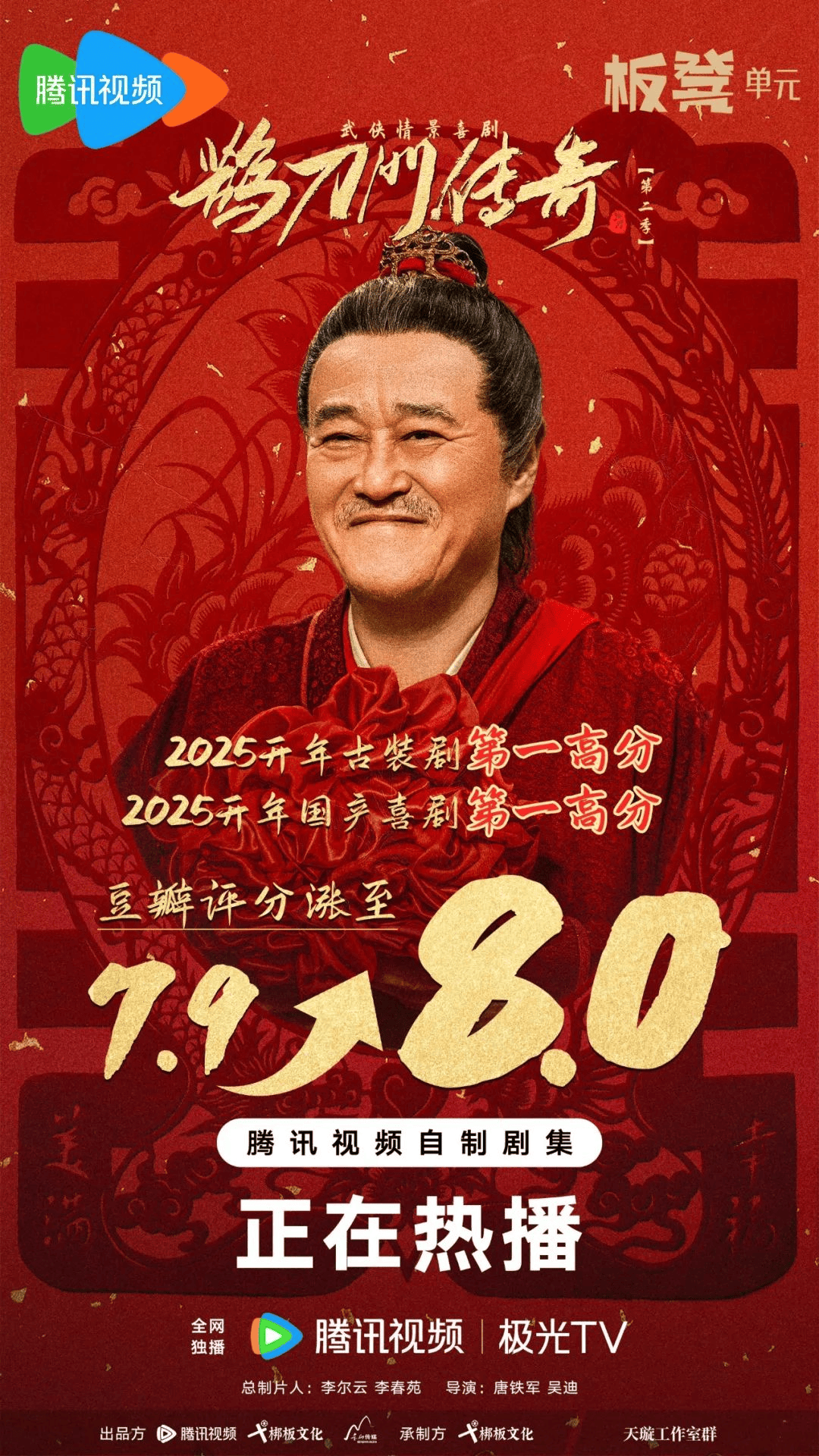 比如将轻武侠与东北喜剧相结合的《鹊刀门传奇2》拿下2025开年豆瓣古装剧及国产喜剧第一高分,其开播后口碑持续上扬,评分从7.9分上涨至8.0分。