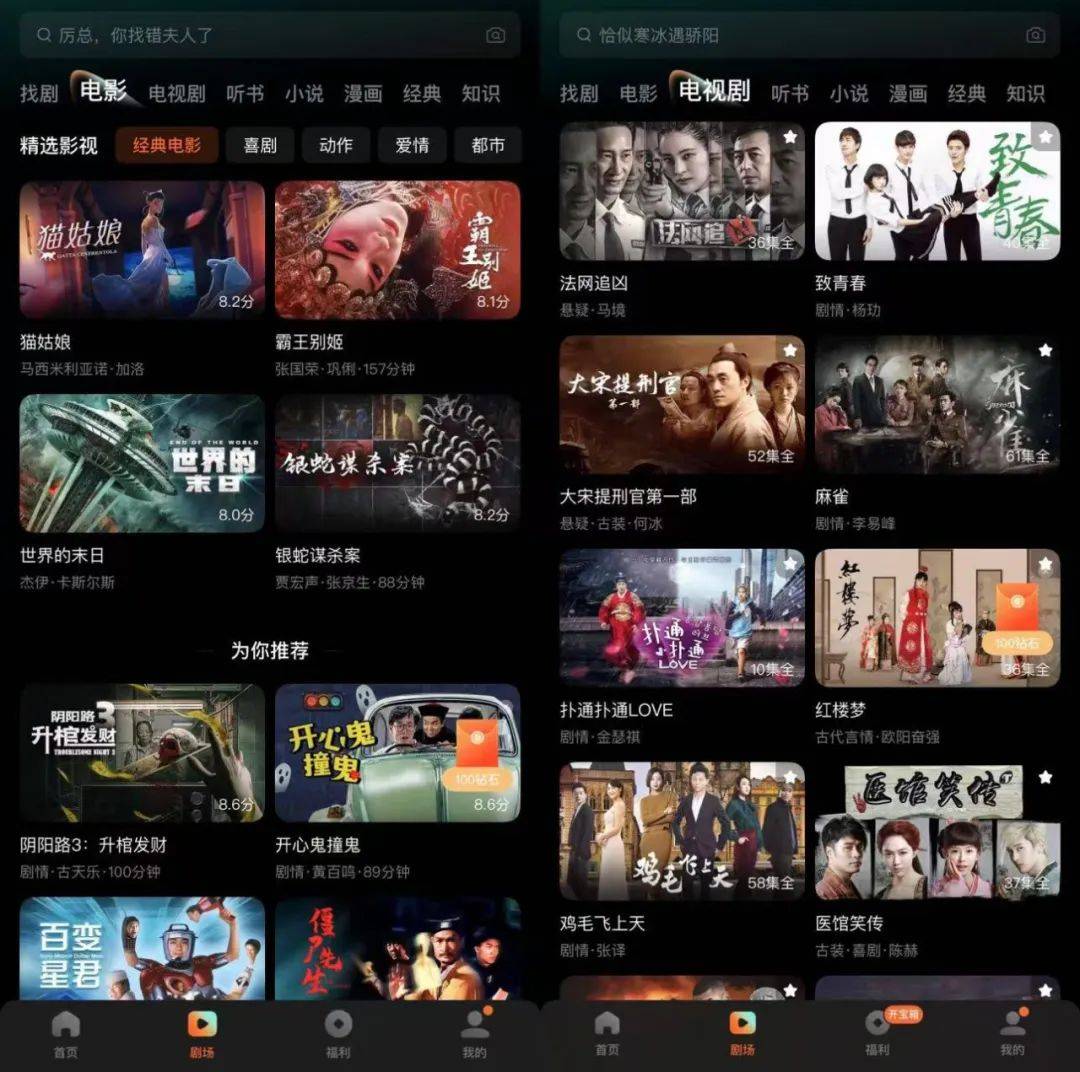 例如在电影分区,页面头部菜单中分为了经典电影、喜剧、动作、爱情、都市、悬疑、现言、古装、奇幻九个大类目。内容上既有《霸王别姬》《阮玲玉》《末代皇帝》等影史经典影片,也有许多认知度并不高,但类型、选题上相对容易切中下沉市场观众审美的项目。