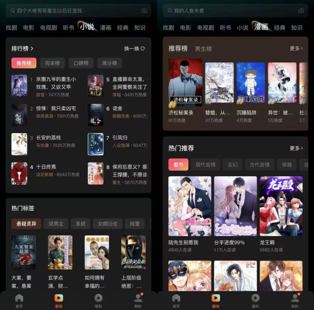 相对应的,在听书、小说、漫画三个分区,内容则集中于网文类或是短剧相关的IP内容,与短剧气质高度对齐。另外还有经典、知识分区,以名著、畅销书等文学类内容为主。