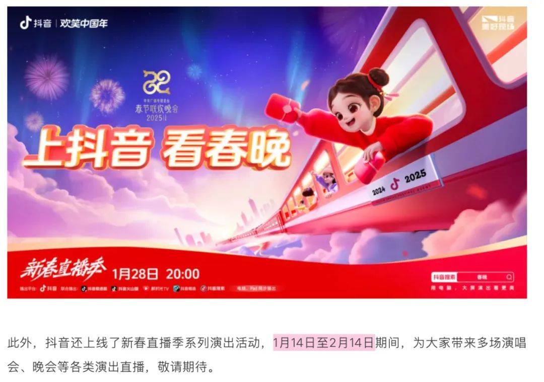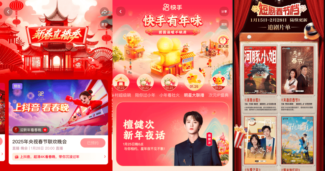 这个前提,推动了两家平台有信心围绕春节流量排播出一个新春直播季。无论晚会、明星直播还是短剧,如今于春节期间刷到这些短视频内容,早已成为很多国人肌肉记忆式的过年新年俗活动。