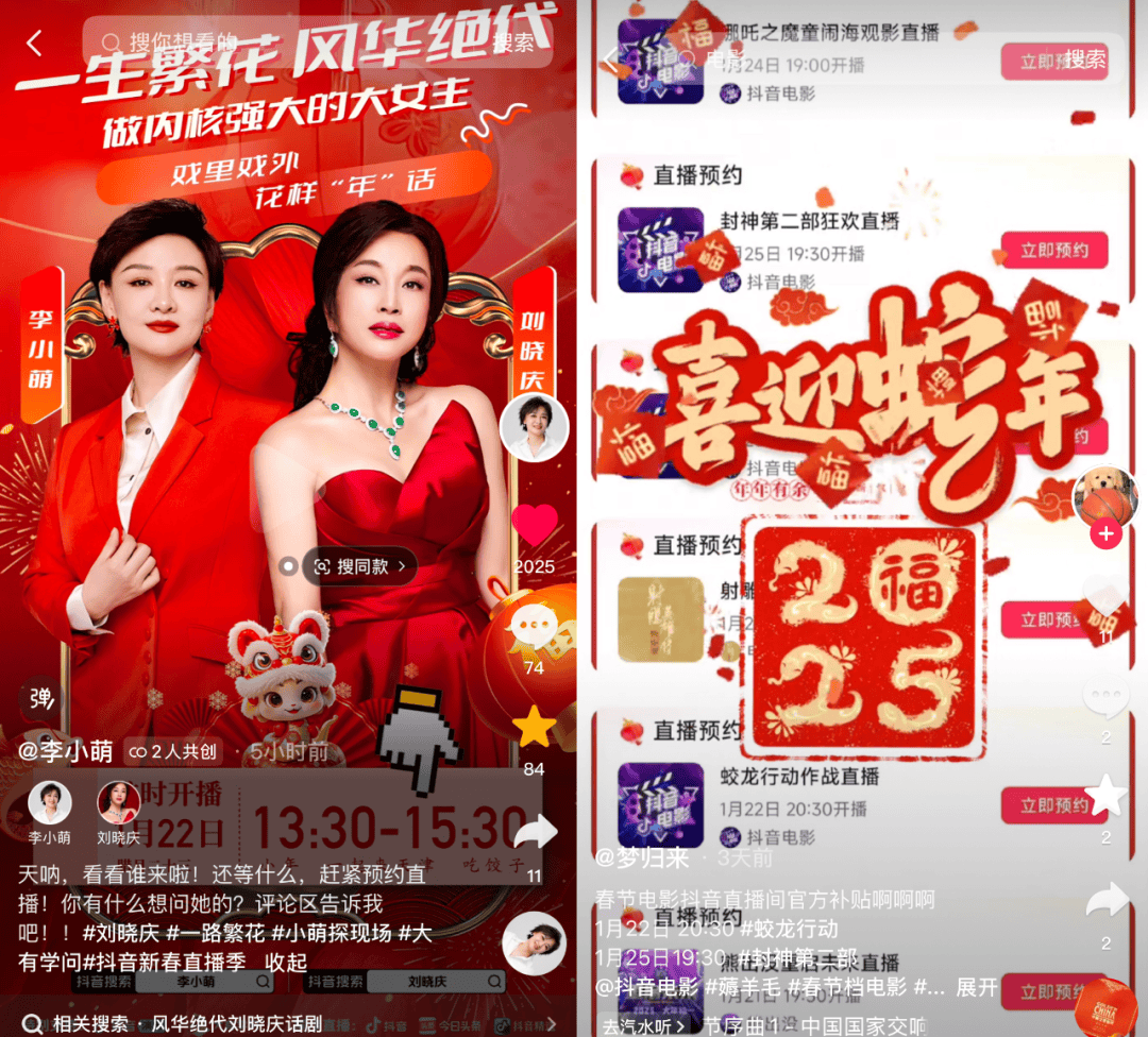比如22日李小萌&刘晓庆的《做内核强大的大女生》小年夜直播,正是抖音挖到原央视资深主持人李小萌点评综艺《一路繁花》庆奶表现的爆款视频为其火速定制的直播项目;再比如,为接住即将到来春节档院线电影大流量,抖音企划了将于22日开播的《蛟龙行动》新春热血作战直播,而后续《哪吒之魔童闹海》《封神第二部:决战西岐》等更多春节档电影剧组也会来抖直播共享流量盛宴……
