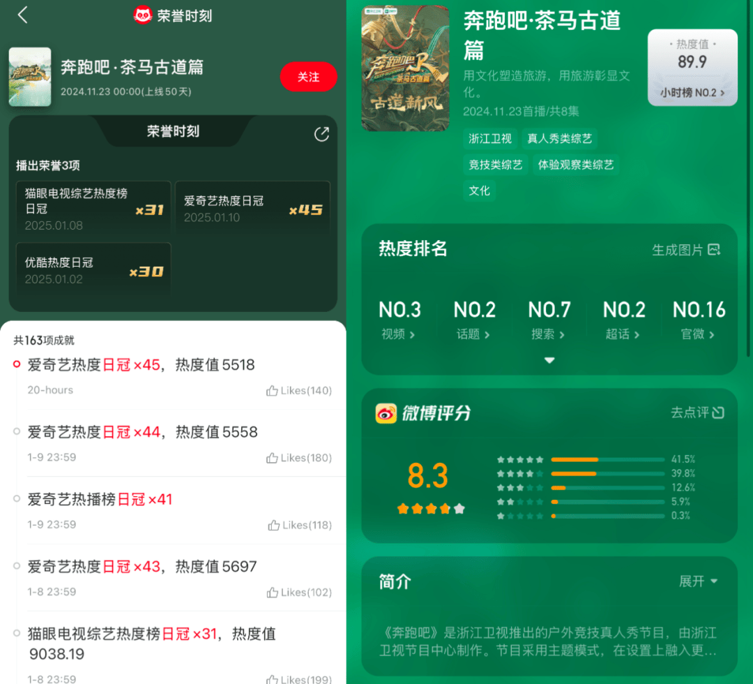 最近刚在浙江卫视、Z视介收官的《奔跑吧·茶马古道篇》就是明证。一是节目屡登猫眼电视综艺热榜TOP1、骨朵电视综艺连续一周上榜TOP1;二是节目微博开分达8.3分,小红书上 #白鹿的头全场最忙 、#白鹿对着张真源贴脸开大 等热梗话题屡登高位热点,B站《我从没想过!我会把国民综艺拿放大镜看上一百遍!》等二创稿件掀起像素级研学“昀牵孟绕CP”的嗑糖风暴,节目在各大社媒平台均引发热烈讨论。