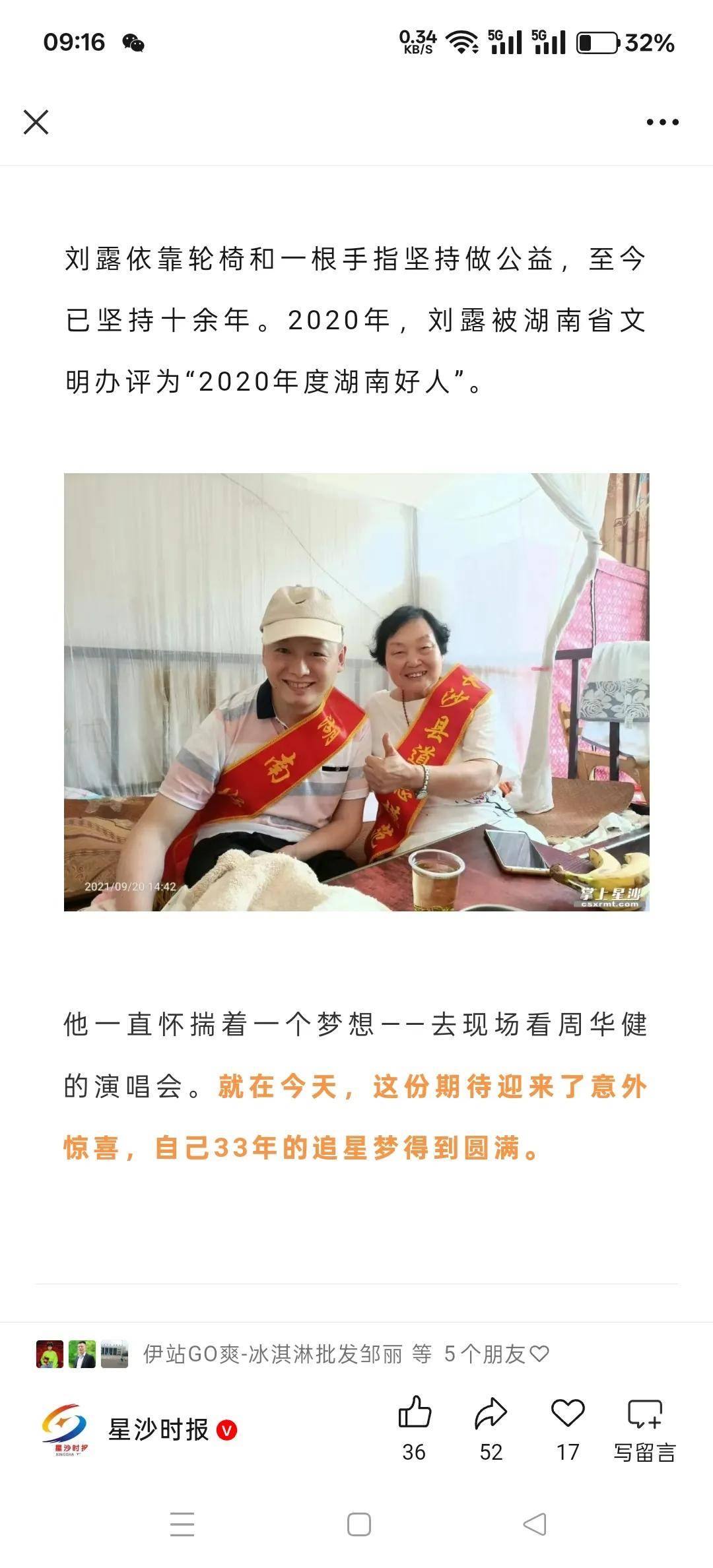 正值周华健“少年的奇幻之旅3.0”巡回演唱会长沙站第二场演出之前,刘露终于如愿与她的偶像,周华健,合影并拥抱。这场对她来说意义非凡的见面,跨越了生死和世纪的距离——对于高位截瘫33年且存在语言障碍的刘露来说,这一刻是无比珍贵的。