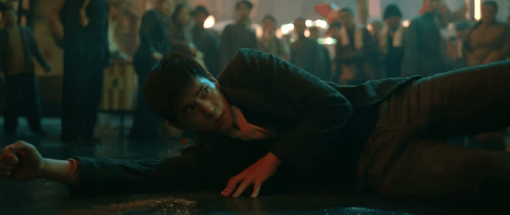 王安宇扮演的阿莱在民国上海滩街头奔跑,后面一大帮黑衣人在追杀他。