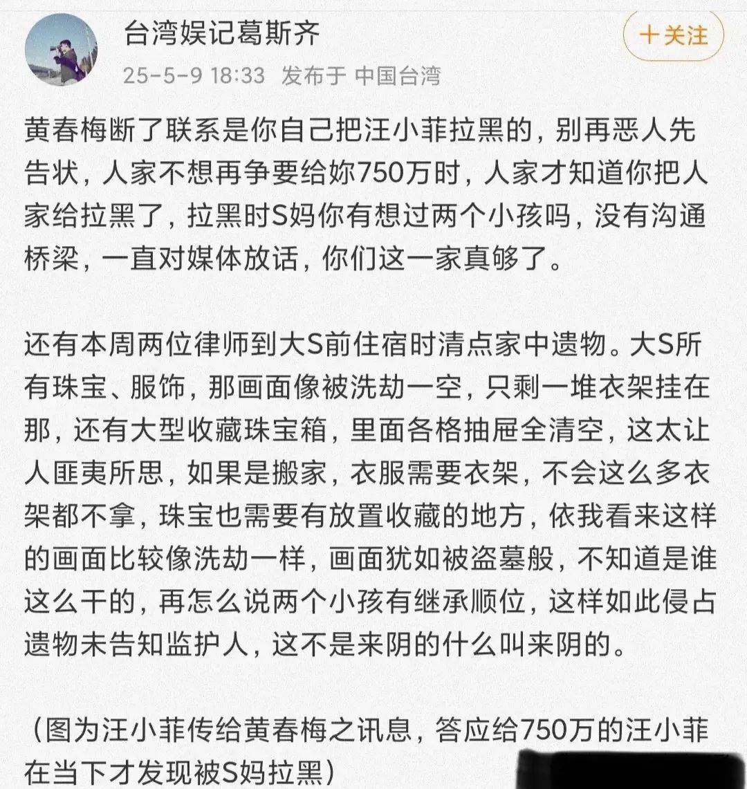 但真正引发轩然大波的是爆料的后半部分内容。葛斯齐透露,大S已故亲人故居内的贵重遗物不翼而飞,仅余空荡的衣架。他在文中连番质问:"究竟是谁搬空了这些物品?"