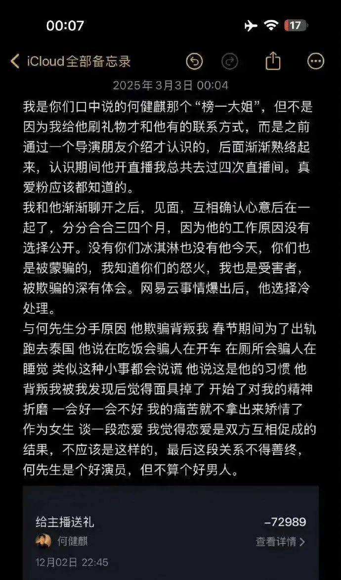 演员何健麒因一则网友爆料登上热搜。一位自称是其直播间“榜一大姐”的网友凌晨在社交平台发文,不仅晒出为男方刷礼物的截图,更爆料其出轨,并详细描述两人从相识到相处的过程,引发网友热议。